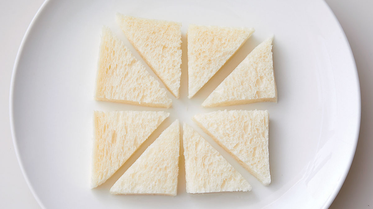 食パンを三角形に切り分け、ツリーに見立てて並べて1.を塗り、2.をちらす。